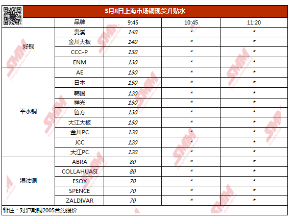【SMM价格】5月8日上海市场铜现货升贴水(第一时段)