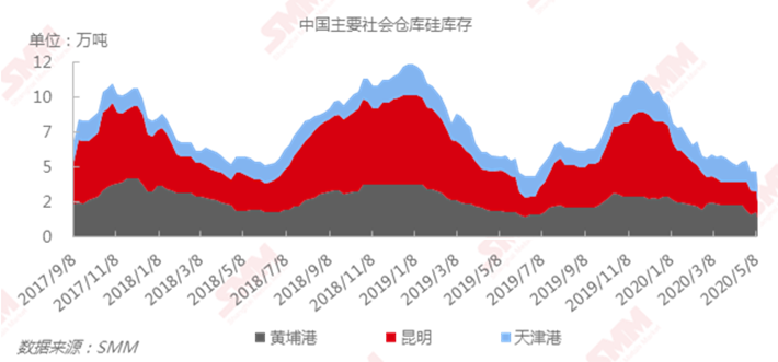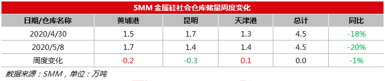 2020年5月8日:5月8日SMM统计金属硅三地社会库存共计4.5万吨,较上周持稳。为减少运输成本,五一假期期间各产地库存向港口及消费地转移,社会库存总量稳定但各地存量涨跌互现。预计近期社会库存稳定为主。