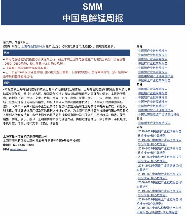 本周电解锰现货交投重心再次逐渐上行。截止本周五国内电解锰主产地现货含税出厂价围绕在10550-10650元/吨,较上周五均价上调50元/吨;