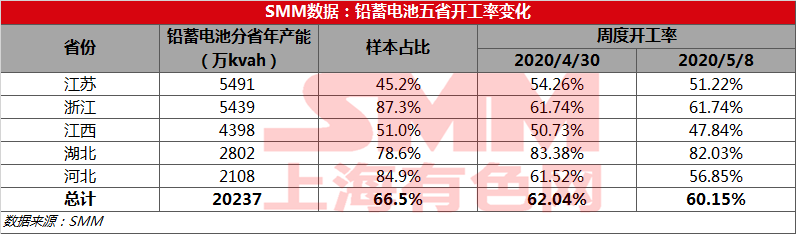 SMM5月8日讯:据SMM调研,本周(5月4日—5月8日)SMM五省铅蓄电池企业周度综合开工率为60.15%,较节前下降1.88%。