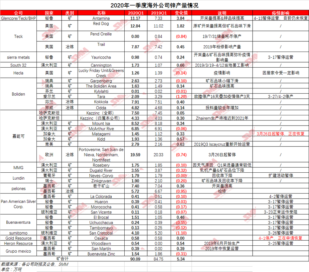 截止本周,海外大部分的锌企业已经发布了2020年一季度的产量报告,目前已公布的企业合计锌精矿产量同比录增5.34万吨,这其实是合理的。但对于2季度,因COVID-19肆虐,对矿山影响较为显著,据SMM测算,截止4月底,目前已发布公告的项目预计影响锌精矿产量逾20万吨,同时还有许多的新矿建项目陷入停滞,部分企业撤销了2020年的产量指引,由此,2020年Q2锌精矿产量环比锐减不存在意外。因目前海外疫情尚未得到完全控制,虽然部分国家已经着手重启经济,但SMM预期锌精矿供应端恢复过程将较为缓慢,同时考虑到恢复后需要执行受疫情影响停滞的合同,实际锌精矿溢出量预计有限,即锌精矿供应的全面过剩可能会延期到2021年发生。对国内而言,预计矿端紧张仍将如预期持续至6月中下旬,部分地区加工费仍有下调空间。