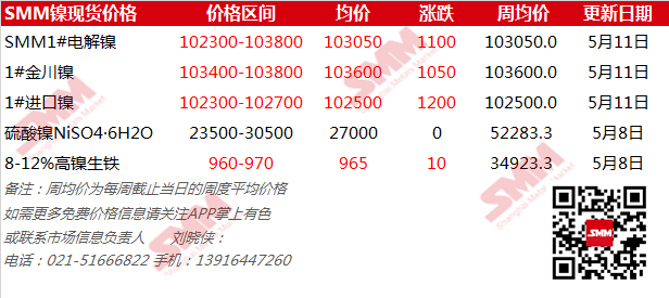 5月11日SMM镍现货价格:SMM1#电解镍均价上涨1100元/吨