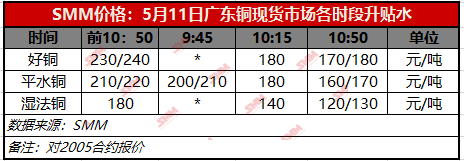 SMM5月11日讯:今日广东1#电解铜现货对当月合约报升水180~180,均价跌55;湿法铜报升水140~升水150,均价跌40。1#电解铜均价为44200元/吨涨515元/吨,湿法铜均价为44165元/吨涨530元/吨。现货市场,虽然今日库存仍在下降,但降幅较之前明显减弱;且绝对价继续走高,再加上月差持续扩大。在众多因素的刺激下,持货商主动降价出货,早盘时好铜和平水铜报价便比上周五下跌30元/吨,到10点15分时继续下调20元/吨至180元/吨,到11点左右更是进一步下跌至160元/吨。面对持续下跌的升水,今日接货者普遍持观望态度,采购欲不强。总体来看,今日升水持续下降,下游接货欲低,市场成交低迷,我们预计明天升水仍会继续下降。