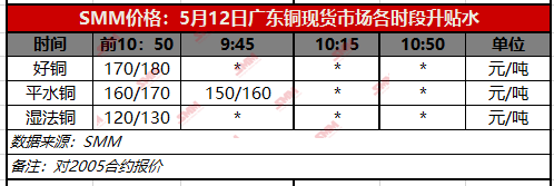 【SMM价格】5月12日广东铜现货市场各时段升贴水(第一时段)