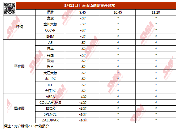 【SMM价格】5月12日上海市场铜现货升贴水(第一时段)