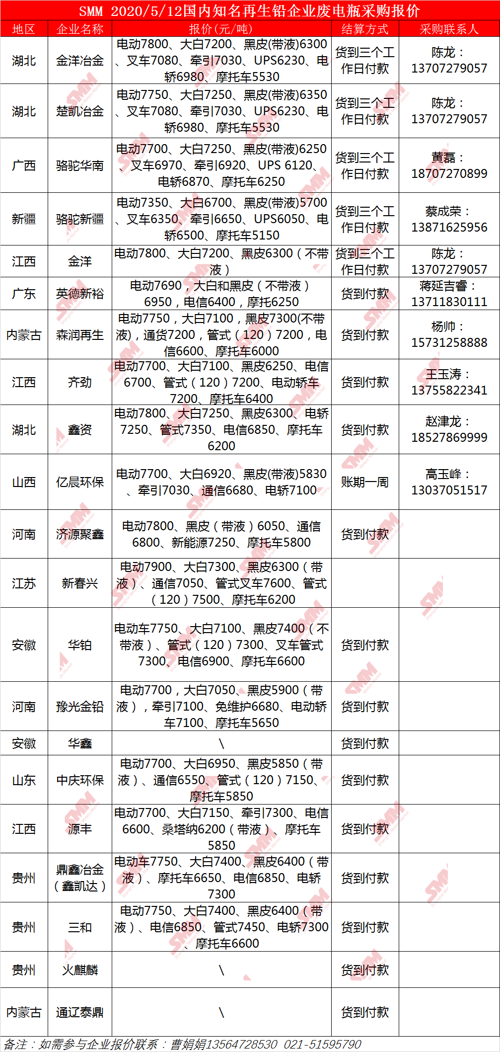 【重磅】SMM 2020/5/12国内知名再生铅企业废电瓶采购报价
