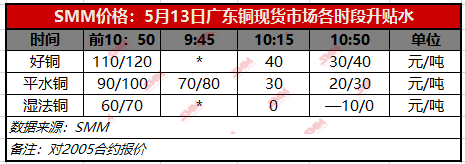 【SMM价格】5月13日广东铜现货市场各时段升贴水(第三时段)