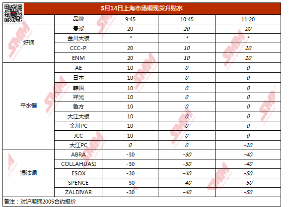 【SMM价格】5月14日上海市场铜现货升贴水(第三时段)
