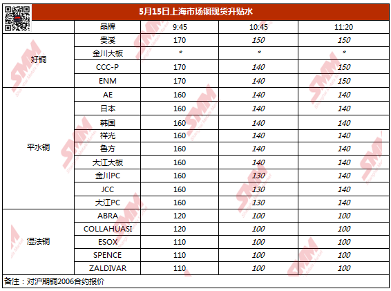 【SMM价格】5月15日上海市场铜现货升贴水(第三时段)