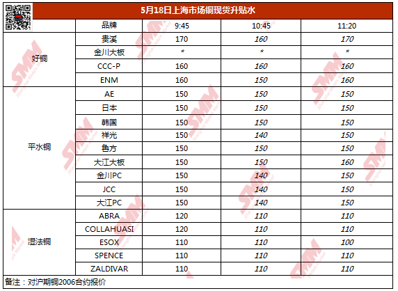 【SMM价格】5月18日上海市场铜现货升贴水(第三时段)