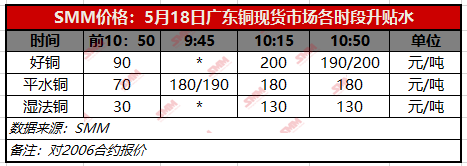 SMM5月18日讯:今日广东1#电解铜现货对当月合约报升水180~200,均价涨110;湿法铜报升水130~140,均价涨100。1#电解铜均价为43285元/吨跌95元/吨,湿法铜均价为43230元/吨跌105元/吨。现货市场,换月后月差仍较大,因此市场并未因周末库存大增而低价出货,反而高价出货。总体来看,今天市场成交价稳定在好铜190/200元/吨,平水铜180/190元/吨,湿法铜在130/140元/吨;但接货不积极,交投活跃度也一般。另据我们了解最近铜杆行业的开工率有所下降,且进口铜仍会陆续清关,因此,我们预计后市升水难以继续大幅上升,料震荡回落的可能性较大。