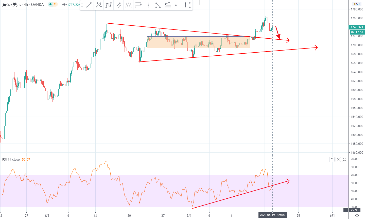 其实昨日咱们对于市场的预期提醒大家黄金追高已经不合适,并且表明市场在1770关口的看空观点。隔夜市场最高冲击至1765后走出跳水行情,如果你看了我的文章应该就不会高位追涨也是成功的规避了市场跳水的亏损。