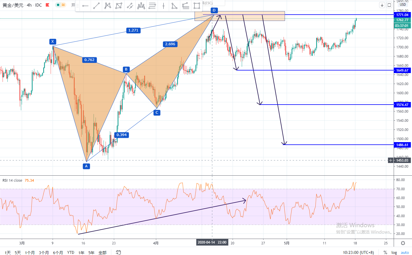 5.18日黄金分析:但是今天我要提醒大家重点留意市场在1770的抛盘,如果实体大阳线强势突破上涨,那么说明黄金看空蝴蝶形态失效。但是在1770附近收出反转看空的K线形态的话,切记不能再追高。因为这个点位属于看空反转的价格。避免被套在顶部