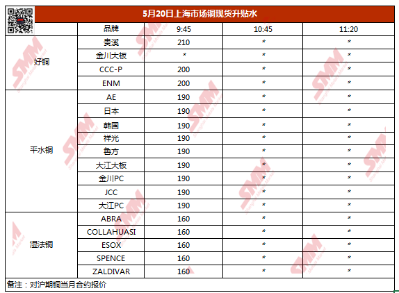 【SMM价格】5月20日上海市场铜现货升贴水(第一时段)