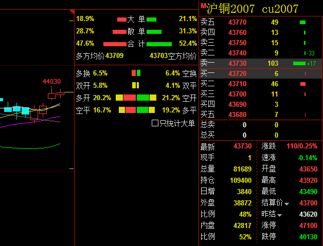 日内沪铜高走主要受原油价格上行带动,受原油供需矛盾进一步改善影响,美油和布油今日涨幅有所扩大,从而联动铜价上涨。美联储FOMC会议以及日本央行货币政策会议即将开启,市场押注将会推出更多的经济刺激政策;国内“两会”即将召开,市场期待更多利好政策出台。市场风险偏好受提振,助力铜价上冲44000关口。今日沪铜主力2007合约早间开于43590元/吨,多头势力入场拉升铜价至43740元/吨,但上涨动能有限,铜价围绕43710元/吨一线短时震荡。此后多头再次发力叠加空头陆续减仓,铜价自43690元/吨震荡上行,午盘收于43810元/吨。午后开盘铜价延续涨势,冲高至日内最高点43920元/吨。此时多头获利离场,铜价有所回落,最终收于43730元/吨。日内沪铜指数持仓量增加40手至33.7万手;成交量减少24055手至18万手。
