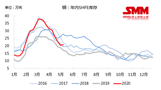 国内精铜消费走弱是溢价下行的主要原因。据SMM调研了解,进入5月后企业新增订单表现下行,为完成前期积压订单而赶工导致的前置消费难以维持。另外,精废价差逐渐扩大至900元/吨附近,废铜价格优势显露,且随着马来西亚方面废铜发运恢复正常,前期精铜替代废铜进行加工的需求将进一步被压缩。从国内去库情况看,上周五上期所铜库存结束八周连降,单周库存上涨4671吨至208890吨,周度涨幅2.29%;上海及广东地区的出库量也有所下降。