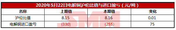 【SMM价格】 2020年5月22日电解铜沪伦比值与进口盈亏