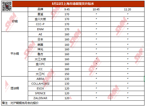 【SMM价格】5月22日上海市场铜现货升贴水(第一时段)