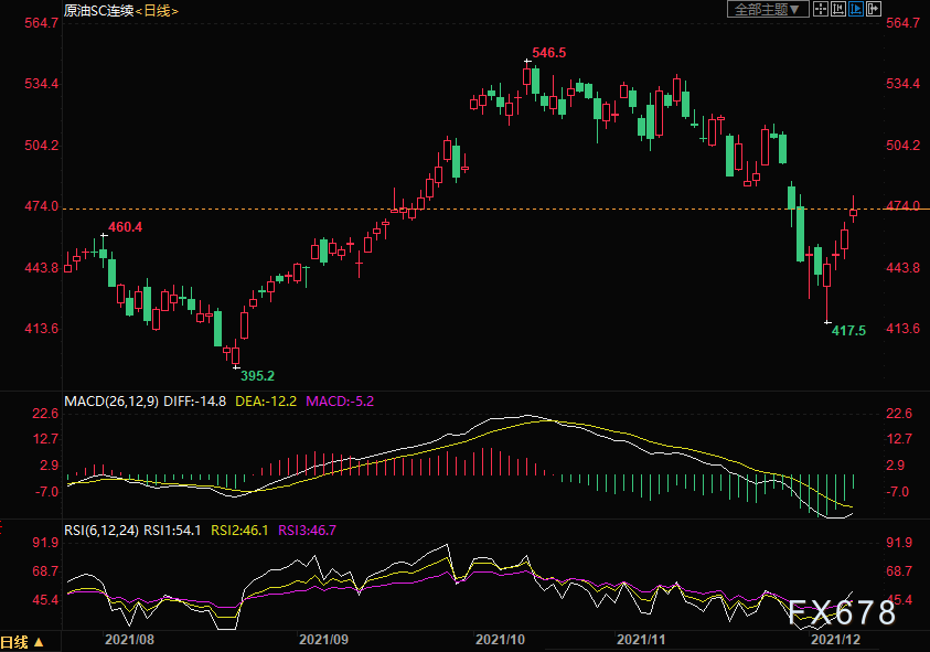 周三(12月8日)上海原油价格上涨3.70%,创逾一周新高,主力合约2201终盘收于473.4元/桶,涨16.9元/桶,人们对Omicron变种对全球燃料需求影响的担忧进一步缓解,且API原油库存大幅减少。
