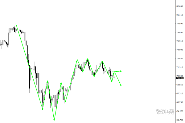 原油昨日冲高回撤,开盘在71.115美元/桶,开盘后上涨高点给到71.99美元承压,随后震荡下跌,美盘最低点给到69.42美元企稳,最后反弹收盘在70.230美元/桶。原油日线收录中阴线,日线震荡后出现二连阴,均线高位死叉向下,运行在油价上方形成阻力。从四小时级别上看,油价在62.4水平企稳后向上运行了一波上涨五浪,但是最后一波上涨触及73.3水平败北,进而出现了失败五浪,进一步转跌,形成N字形向下格局,我计算这波下跌浪上方多空分水岭在72.15美元一线,如果意外上破将改变整体偏空格局,上行阻力位关注70.8-71.2美元阻力,下方支撑关注69.4-67.5美元/桶。综上所述张绅尧总结:今日操作上考虑反弹做空为主,突破后改变回撤做多,上方关注70.8-71.2美元阻力,下方关注69.4-67.5美元支撑。