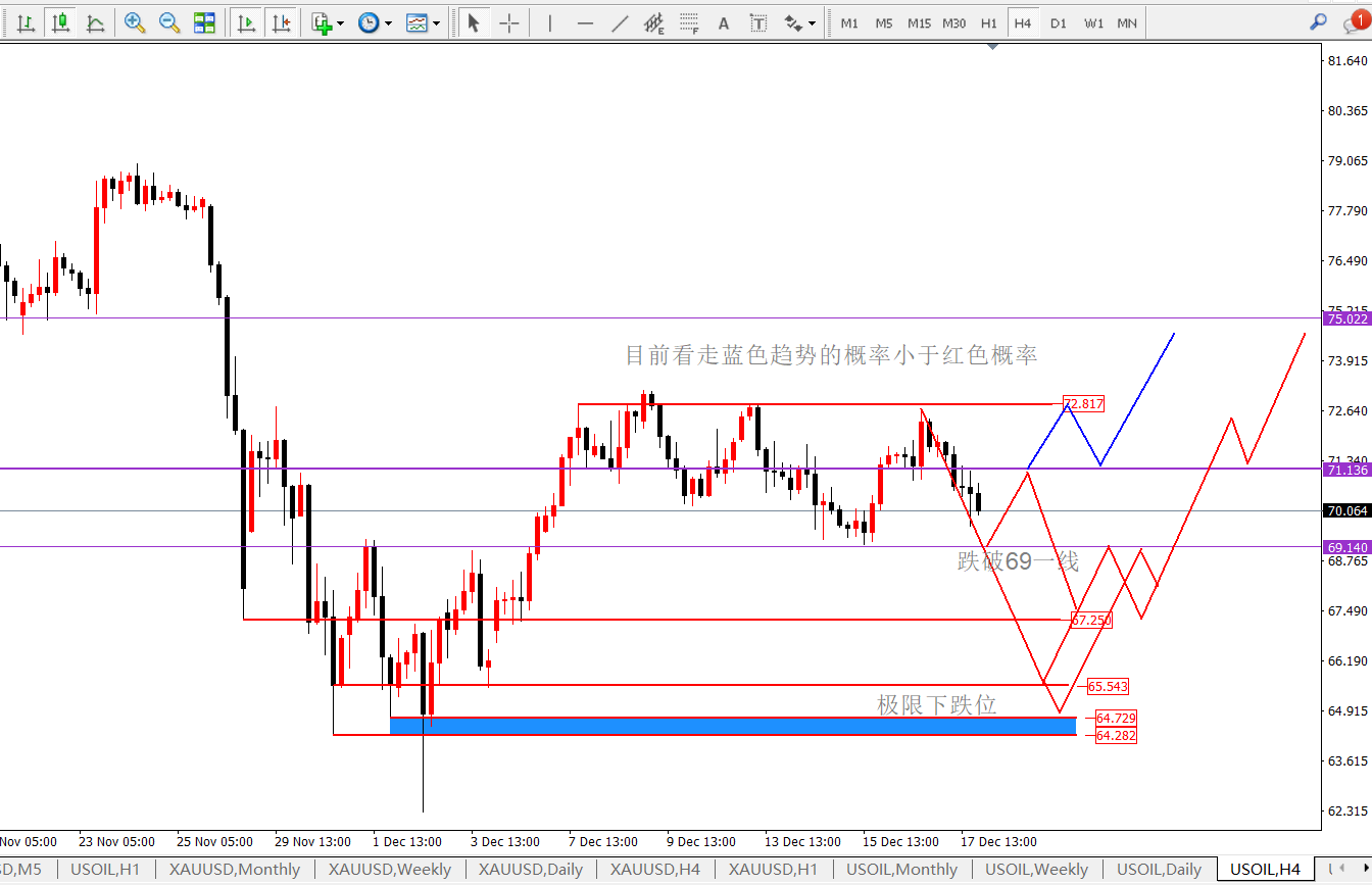 原油前期布局的两拨中线都有所斩获。高点74.8-75的空单完美进行了下跌,而点位62-64多单也完美上涨至73.3附近。目前原油介于中间价为震荡。短期上下需要关注两个点73和69,不管上破和下破都有一定的空间利润;而大区间65-75以及78一线。