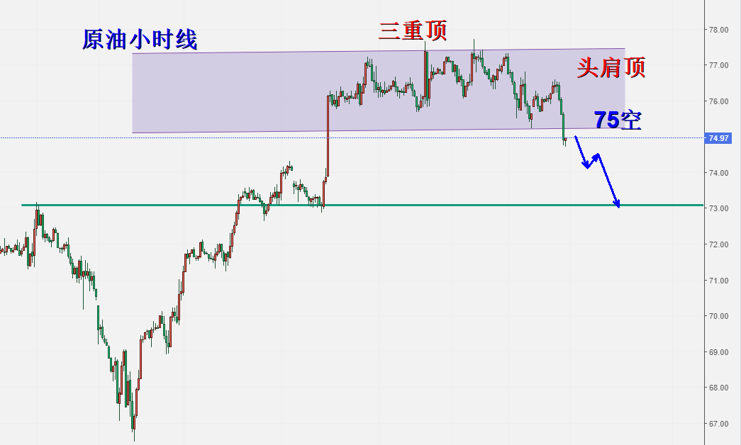 原油小时线也是击穿了震荡区间74.3一线,直接下行,下方支撑位几乎没有,也是明显的头肩顶结构,下方空间巨大,直接奔着73去,跟上?