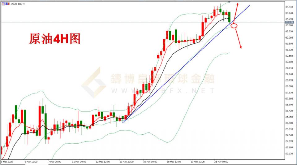 原油四小时周期,从形态上看,油价在经过一轮强势拉升后,多头开始松懈,MA5、MA10均线呈现拐头向下的迹象,且价格已经回落至短期的上升趋势线33.20的支撑位置,下方布林带中轨在32.80的位置对油价形成支撑;原则上,32.80成为日内多空分水岭的概率极大,油价下破32.80之前,多头仍有机会重新向上发力,上方关注34.70的前高压力,上破后有望看向40.00的波段目标,但若油价选择下破32.80,则向下看布林带下轨30.50支撑的概率了加大。
