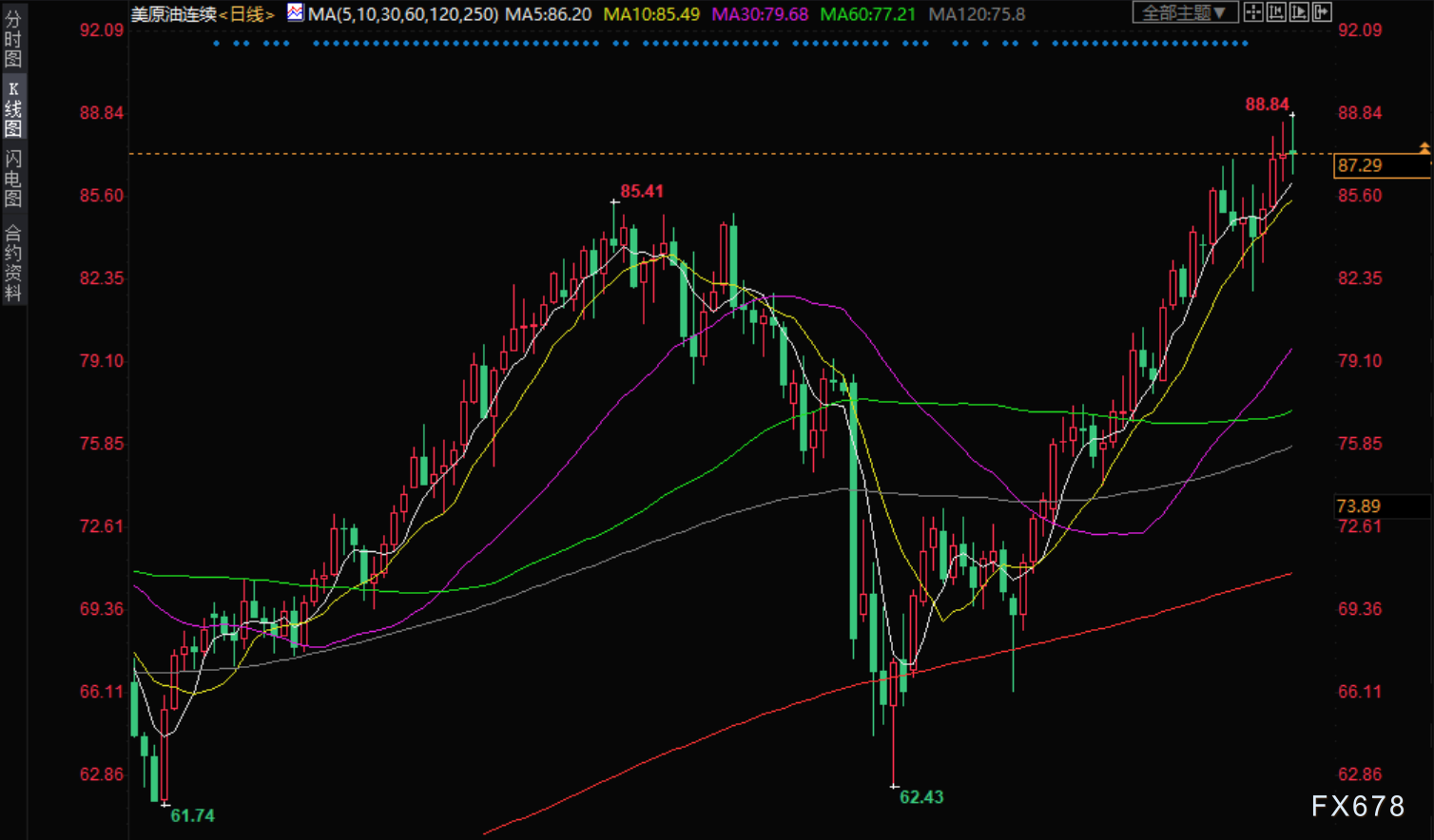 周五(1月28日)布油尾盘上涨1.02%,报收89.07美元/桶。因需求旺盛和供应仍然受限的双支撑下,油价持续上行。按周计算,指标合约录得自去年10月以来最长的涨势。