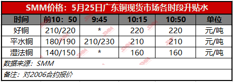 SMM5月25日讯:今日广东1#电解铜现货对当月合约报升水210~220,均价涨10;湿法铜报升水160~170,均价涨10。1#电解铜均价为43805元/吨跌120元/吨,湿法铜均价为43775元/吨跌120元/吨。现货市场,周末归来库存大幅下降,再加上铜价下跌,今日持货商普遍挺价出货。早盘时出货者少且市场报价凌乱,平水铜有报210元/吨,250元/吨甚至有报300元/吨;随着出货者增加,价格开始统一,到10点10分后,市场的主流成交价已经稳定在好铜220元/吨,平水铜210元/吨和湿法铜160元/吨。总体来看,升水走高,接货者普遍持谨慎态度,只维持按需采购,整体交投氛围一般。