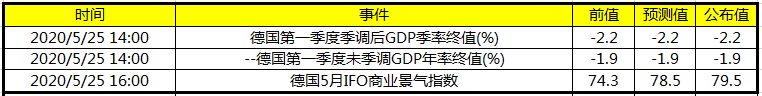 数据方面,德国第一季度未季调GDP年率终值,前值:-1.90%,预期:-1.90%,公布:-1.9%。