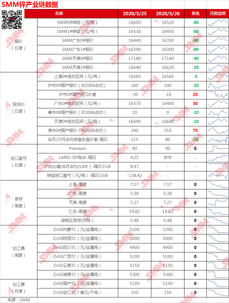 数据包括:锌现货报价、进口盈亏、库存、加工费
