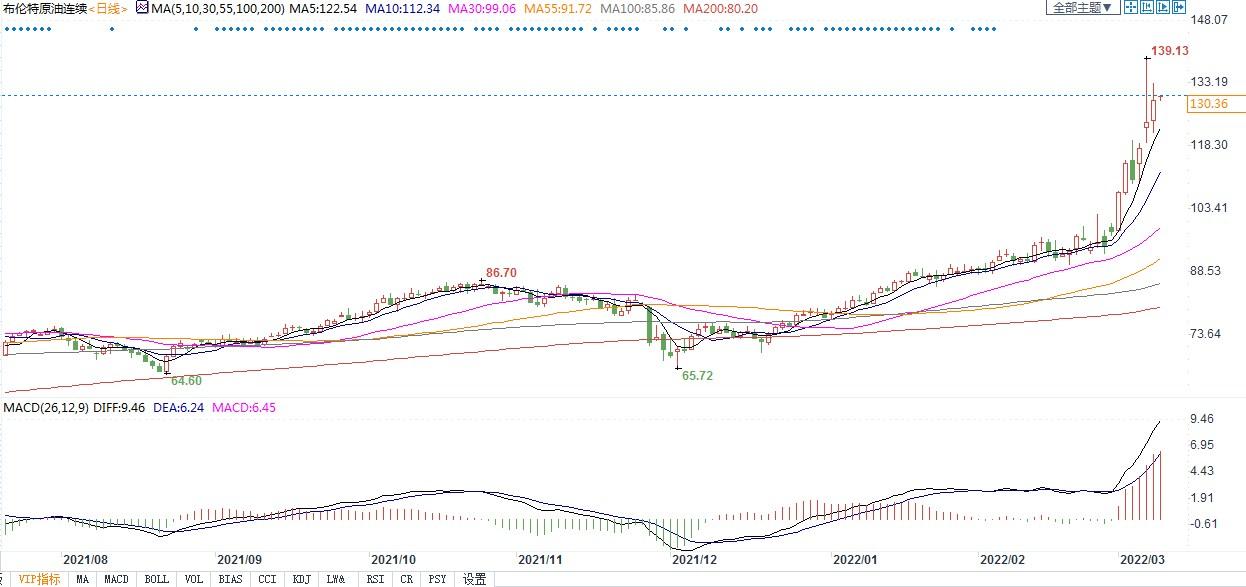 北京时间3月9日10:07,布伦特原油期货价格报130.26美元/桶。