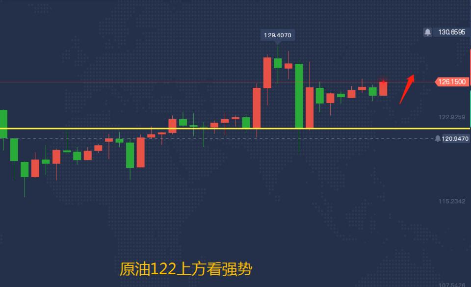 从技术面来看,油价依然要继续看涨,日线收取大阳,只不过凌晨的回撤力度有点意外,过于偏大,不过回撤之后看涨即将启动,因为回撤刚好回踩了日线MA5的位置,其实昨晚悬壶也担心过会不会去回踩一次日线MA5也就是120,但当时价格是在126,原本预计给不到,不然我们就挂单了,所以市场往往都是惊喜和惊吓并存。鉴于油价已经回踩了日线MA5的位置,那么剩下的就是强势继续去看涨,因为大家可以观察最近原油的走势,都是回撤日线MA5之后走反弹出新高,凌晨既然回撤了MA5,那么也就意外着低点出现,涨势会持续爆发,而英美欧盟禁运俄罗斯原油,会导致原油紧缺,也会持续抬高油价,毕竟他们是原油的消耗大户,所以不要去猜顶,尽量顺势多,日内支撑关注123.2-122.7-122分批去看涨,防守121.4,上方继续看126-128!最近行情大家也是可以根据自己的仓位去合理分批资金来交易,因为止损带的大,仓位肯定就要轻。日内的多空分水岭就在120,如果仓位允许是可以大止损轻仓去做的!只要不破120大胆看涨!不过悬壶看好回撤极限122!