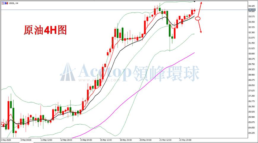 从上图美原油四小时周期走势图来看,上周油价在布林带下轨30.80位置获得较强支撑,随后油价迅速企稳并重回布林带中轨上方,MA5、MA10均线金叉向上,尤其是MA10均线在33.50位置对油价形成支撑,表明短线多头动能强劲,原则上,价格下破33.50之前,仍将上行,上方关注34.70的前高附近压力位,上破后有望看向40.00的波段目标,但若油价选择下破33.50支撑,则下方关注30.80的支撑,下破后将进一步看向25.00支撑附近;操作上,今日可以在33.60附近做多原油。