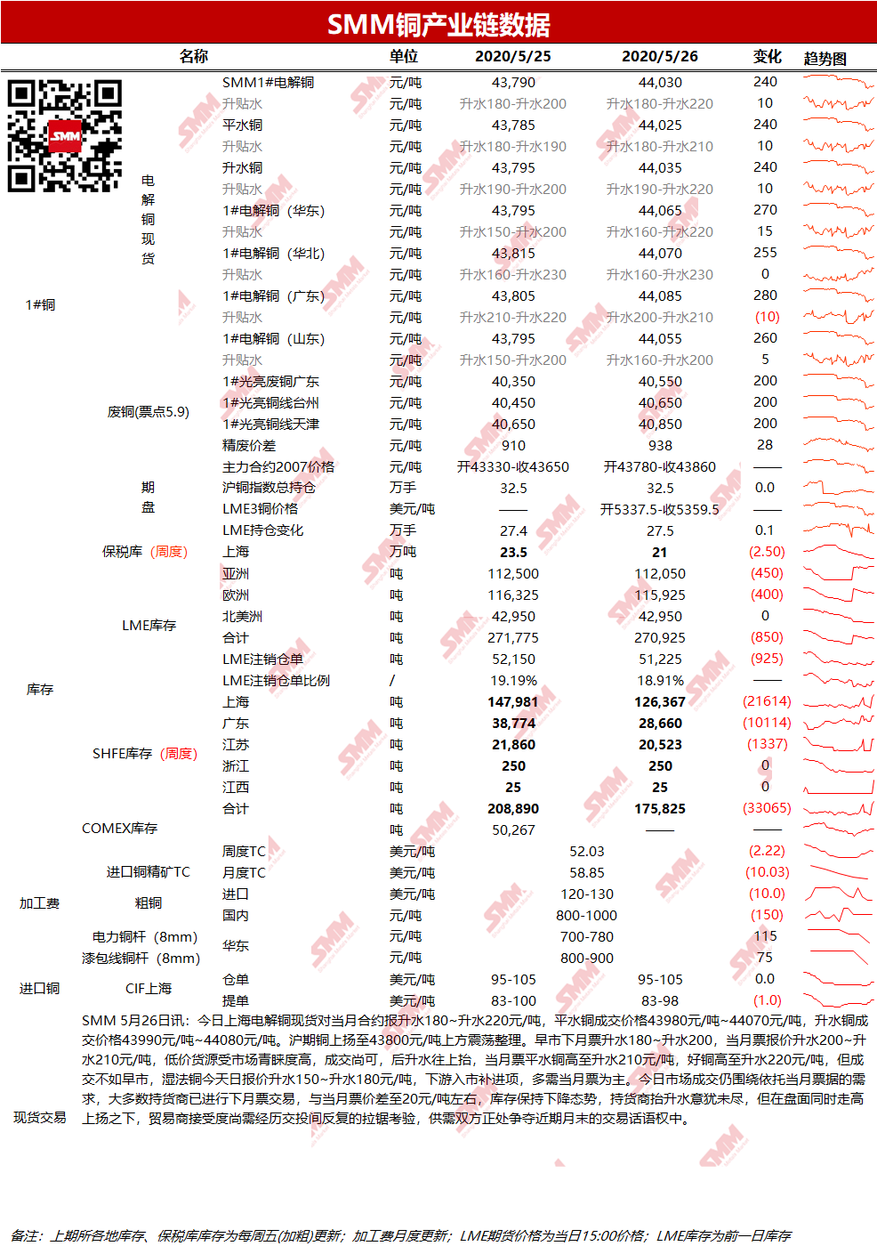 5月26日LME铜库存环比减850吨至270925吨;上期所铜仓单库存环比减1546吨至58408吨。
