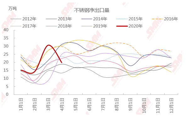 据统计,2020年4月,我国不锈钢出口总量为31.31万吨,环比下降5.48万吨,降幅14.88%;同比去年增幅4.86%。