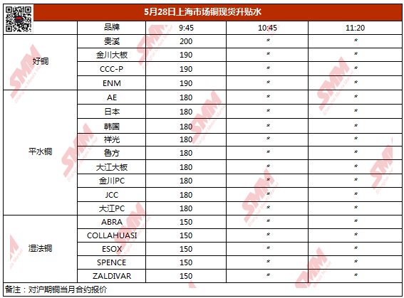【SMM价格】5月28日上海市场铜现货升贴水(第一时段)
