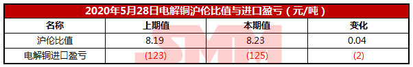【SMM价格】 2020年5月28日电解铜沪伦比值与进口盈亏