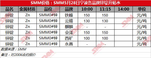 5月28日0#锌宁波各品牌升贴水