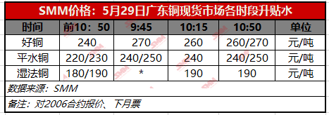 SMM5月29日讯:今日广东1#电解铜现货对当月合约报升水240~260,均价涨15;湿法铜报升水...