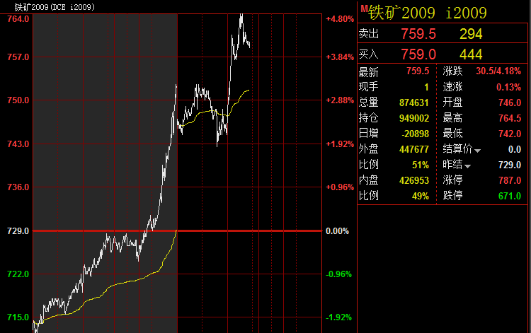SMM6月1日讯:本周首日,铁矿石期货延续上涨势头,开盘不久便突破760元/吨,涨逾4.3%!不过部分交易者趁高价获利落袋为安,现减仓逾2万手。
