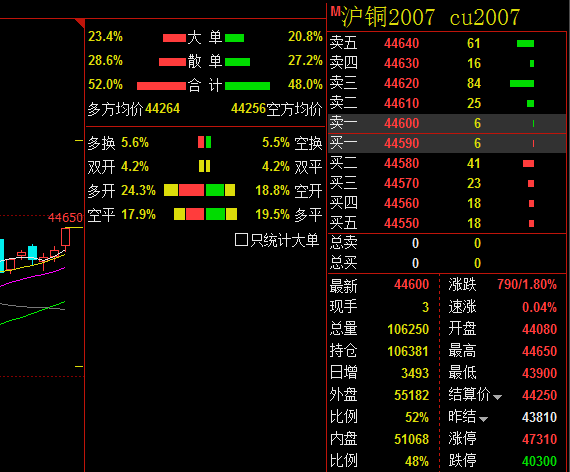 日内沪铜高走,主因宏观情绪进一步回暖。昨日公布的我国5月官方制造业PMI以及非制造业PMI均位于荣枯线上方。今日出炉的5月财新中国制造业PMI升至50.7,重回扩张区间,再次印证了投资者对于我国经济运行恢复情况良好的预期,铜价受到提振大幅上涨。今日沪铜主力早间高开于44270元/吨,开盘后多头势力入场叠加空头减仓拉动铜价稳步上升至44480元/吨,而后在多空势力博弈之间,铜价重心企稳于44400元/吨位置并做横盘整理,午盘收于44370元/吨。午后开盘多头继续发力,铜价攀升至日内最高点44650元/吨,而后铜价围绕44560元/吨一线震荡调整,最终收于44600元/吨,涨790元/吨,涨幅1.80%。沪铜指数日内增仓9185手,至32.9万手,主要表现为多头增仓;成交量增加3.4万手,至22.1万手。