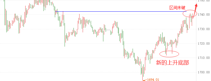 周一:5月的交易已经结束,上周收官我们取得了不错的利润。6月的到来,我们也要一起加油,做好每一次交易,打好每一场仗!从前期黄金下探1680止跌,然后黄金形成上升新高后到目前的平稳震荡。价格目前已经算是震荡偏强,并没有围绕1680-1740区间震荡。自然,这个1740日内已经触摸了一下,从新确立1725一带的支撑有效性,不过上周的震荡已经开始逐步结束之前的震荡下行,周五最后凌晨的上升意义非常大,因为前面两周虽然也是震荡上行,但周五多头总是不如人意,所以破位区间的机会来了了!