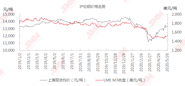 2020年年初以来,沪伦比值不断走高,年初尚徘徊于7.6-7.9附近,至5月底已扩张至8.3-8.6之间,铝价内强外弱,沪伦比值不断走高背景下,铝锭进口窗口逐步打开。因存在市场套利空间,国外铝锭开始流入中国国内。