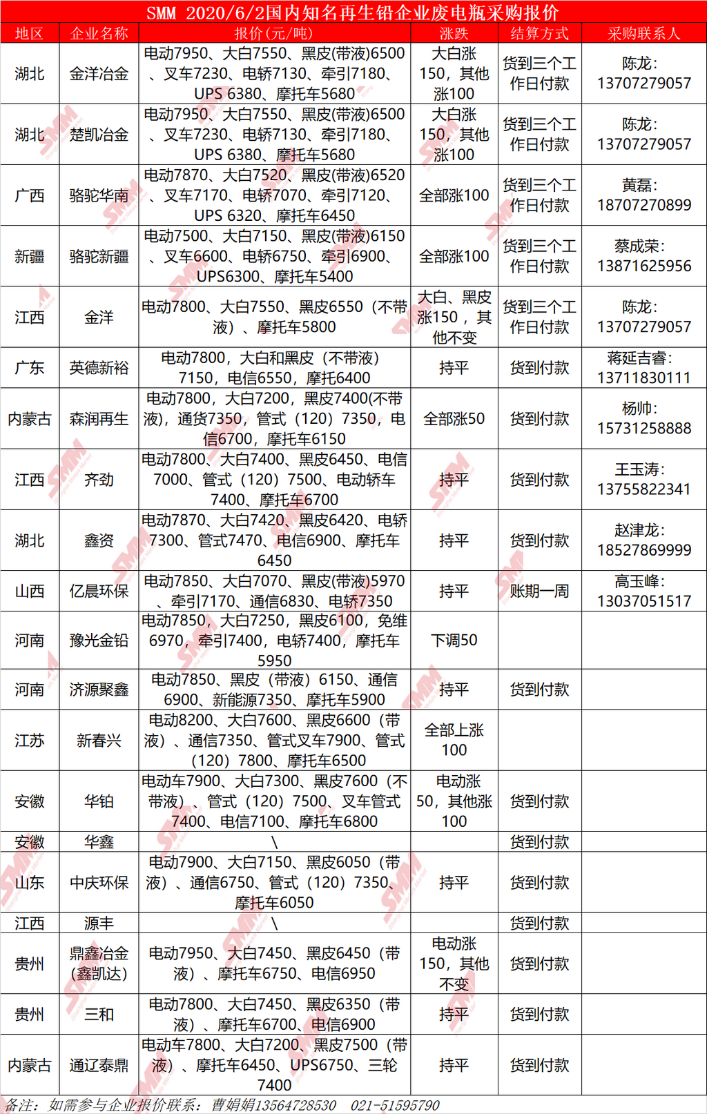 6月2日SMM国内知名再生铅企业废电瓶采购报价