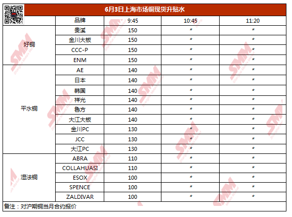 【SMM价格】6月3日上海市场铜现货升贴水(第一时段)