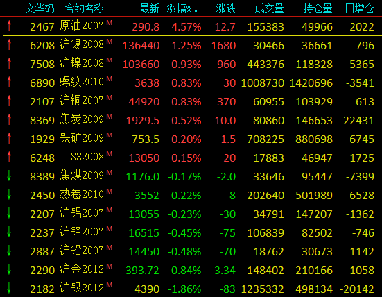 截止9时40分,金属及原油市场合约情况: