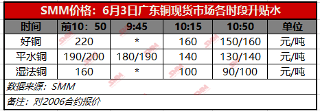 SMM6月3日讯:今日广东1#电解铜现货对当月合约报升水140~160,均价跌60;湿法铜报升水100~110,均价跌60。1#电解铜均价为45160元/吨涨170元/吨,湿法铜均价为45115元/吨涨170元/吨。现货市场,进口铜陆续到货,今日库存难得大涨,早盘时有持货商报平水铜180/190元/吨,但成交寥寥无几,10点后有大贸易商开始大量降价出货,升水持续下降,到11点时平水铜已经降至130元/吨左右,好铜150元/吨左右,湿法铜90元/吨左右。接货者普遍预计随着到货增加,未来升水仍有下跌空间,因此并不着急接货,今日接货并不积极,总体交投一般。