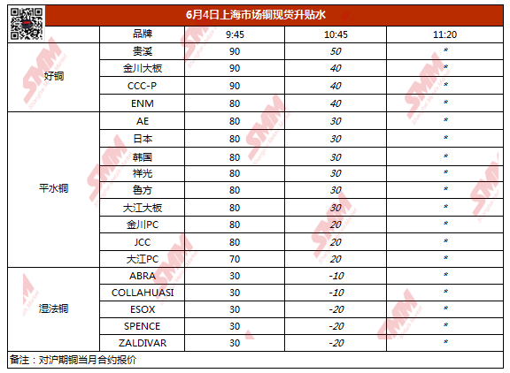 【SMM价格】6月4日上海市场铜现货升贴水(第二时段)