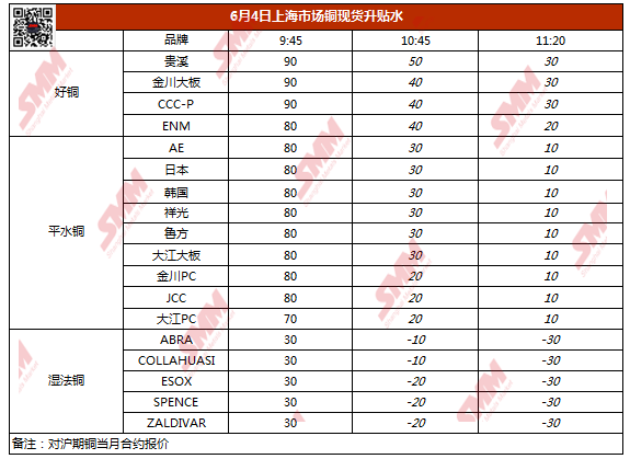 【SMM价格】6月4日上海市场铜现货升贴水(第三时段)